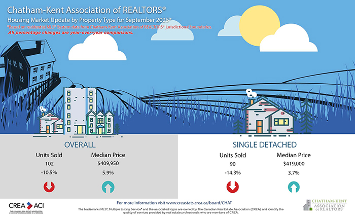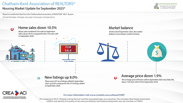 According to figures released from the Chatham-Kent Association of Realtors (CKAR), just over 100 homes changed hands in September, a drop of about 10.5 per cent from September 2024.